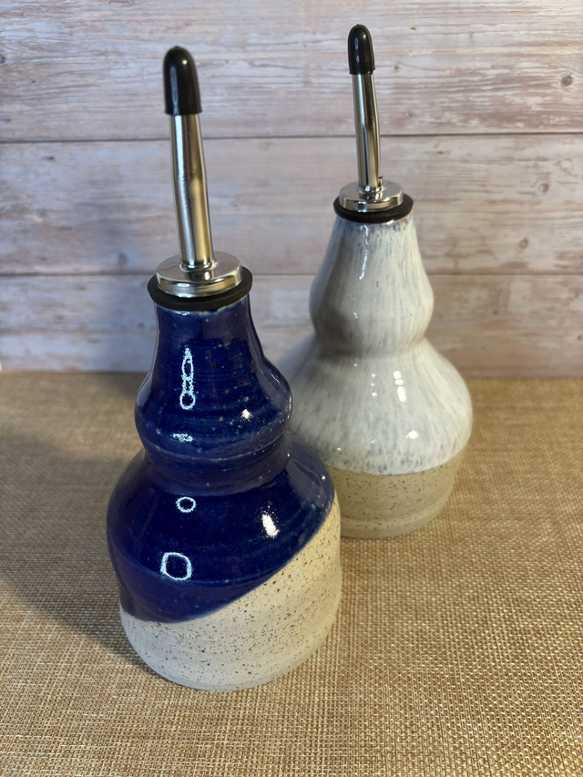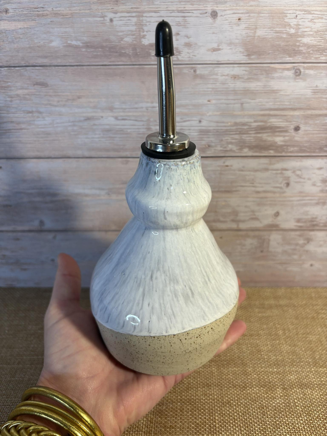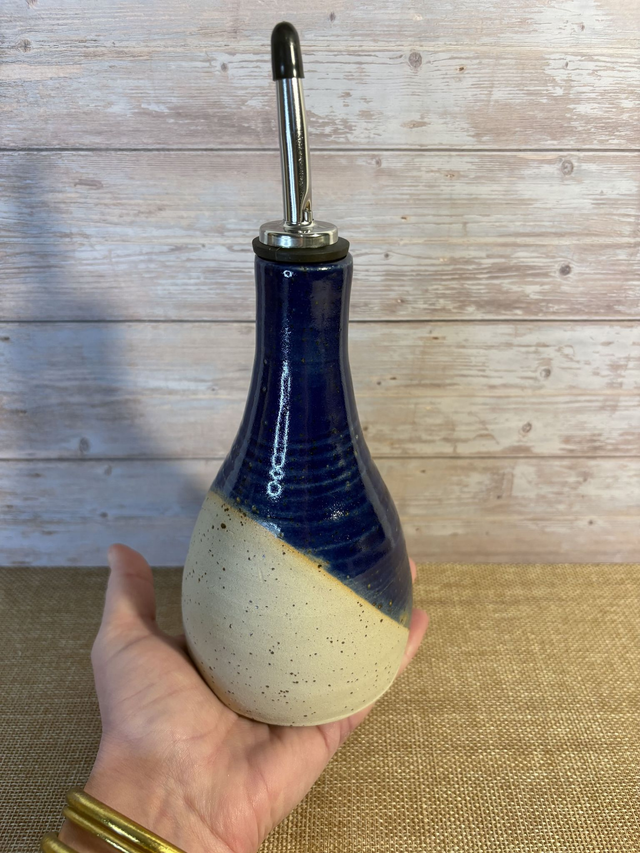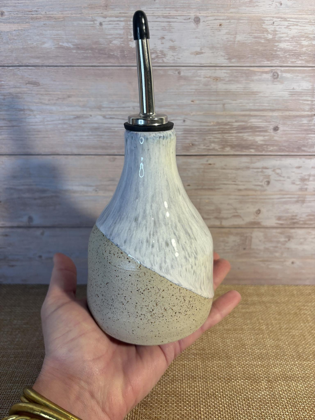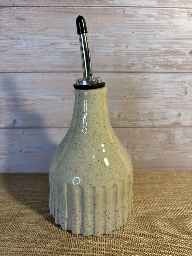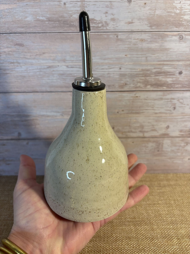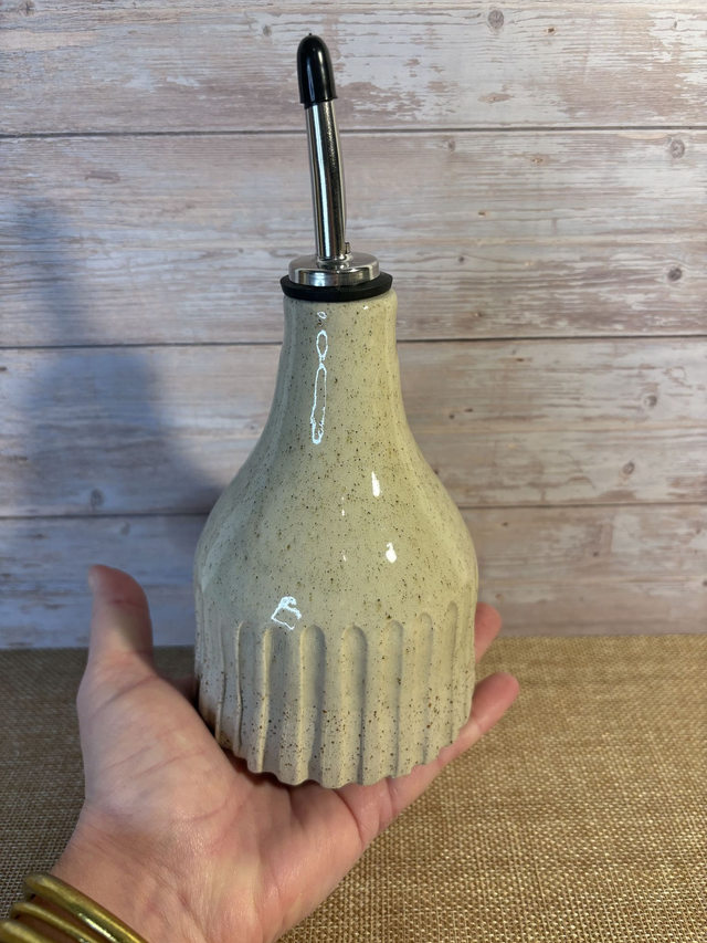 Cette bouteille d'huile est fonctionnelle et décorative à la fois, elle a une certaine sobriété. Fabriquée dans un argile de grès moucheté, elle peut contenir tous les petits liquides tels que l'huile d'olive, le vinaigre ou autres sauces.